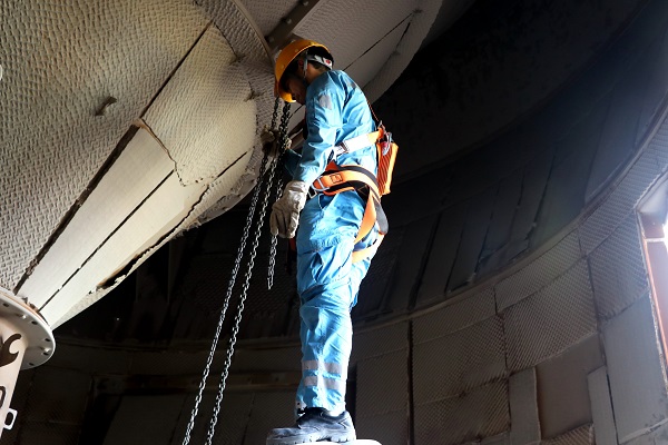 建德海螺2號(hào)原料磨內(nèi),維修工徐濤正在對(duì)CK450磨內(nèi)進(jìn)行貼補(bǔ),悶熱的環(huán)境和浸透的衣衫,他挺立的身軀不為所動(dòng)。(王浩然/攝)