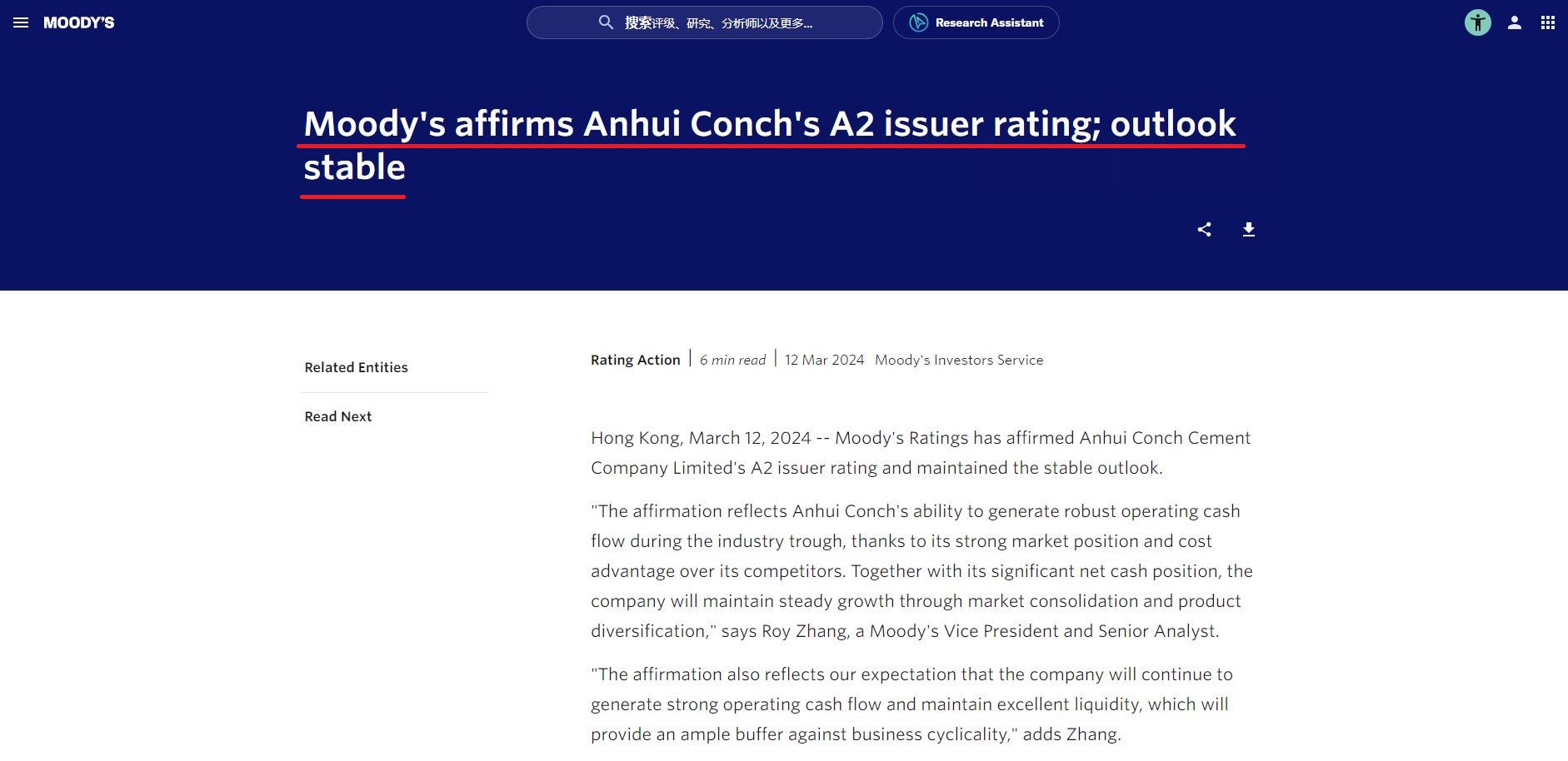 3月12日,國際金融評級機(jī)構(gòu)穆迪(Moody’s Ratings)宣布保持安徽海螺水泥股份有限公司A2發(fā)行人評級,評級展望維持“穩(wěn)定”。據(jù)了解這也是全球建材行業(yè)最高評級,而海螺水泥已連續(xù)七年獲此評級。