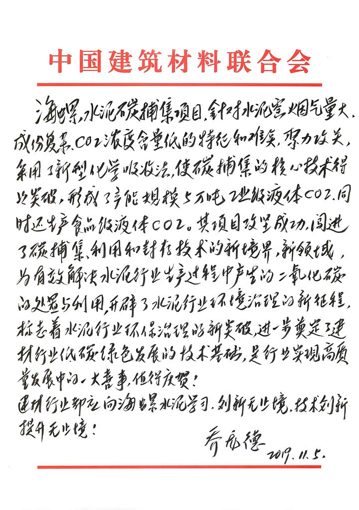 2019年11月5日,中國建筑材料聯(lián)合會會長喬龍德致信海螺集團,對海螺水泥碳捕集項目給予高度評價,表示慶賀,號召建材行業(yè)向海螺水泥學習。