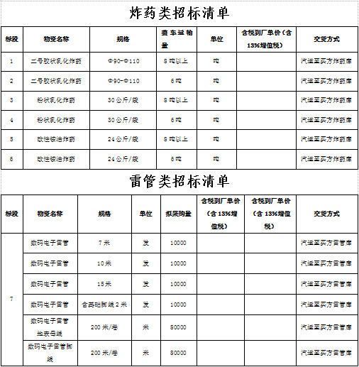 1.招標物資名稱:火工材料(膠狀乳化炸藥、改性銨油炸藥、粉狀乳化炸藥、工業(yè)雷管及導爆管)。