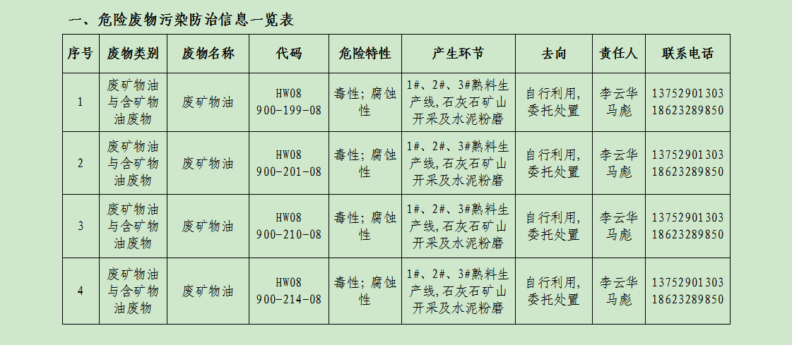 廢棄物的產生單位及管理:礦山分廠由俸云龍負責管理,負責督促員工把產生的危廢分類定期送危廢庫暫存,危廢庫由維修工段工段長負責,負責收集并記錄危廢臺賬;主廠區(qū)由易軍負責管理,負責督促員工把產生的廢分類定期送危廢庫暫存,危廢庫由環(huán)保主管馬彪負責,負責收集并記錄危廢臺賬。危廢庫危廢定期聯(lián)系重慶海創(chuàng)環(huán)??萍加邢挢熑喂尽⒅貞c云青環(huán)??萍加邢薰?/span>等有資質公司回收處理并完善相應危廢聯(lián)單。