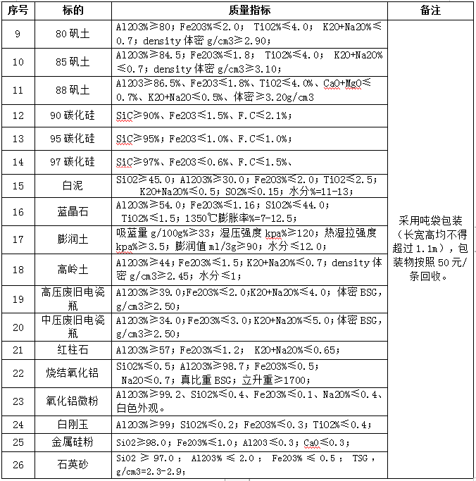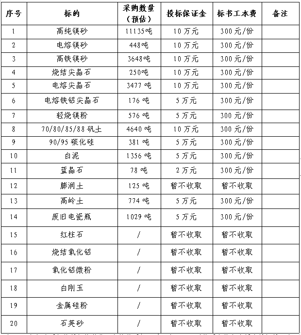 4、上述88礬土、97碳化硅、紅柱石、燒結(jié)氧化鋁、白剛玉、金屬硅粉和石英砂等招標采購原材料,因采購量不確定,本次招標僅作為本公司采購備用原材料??紤]上述原材料存在無執(zhí)行情況,投標保證金、標書工本費和合同履約保證金暫不收取。