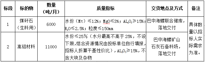 備注:標(biāo)段2可選擇目錄為“霞石粉末、制砂粉末、高鋁粘土、建筑垃圾”中的一種,也可根據(jù)自身資源填報其他物資名稱,質(zhì)量必須滿足招標(biāo)方使用,合同質(zhì)量指標(biāo)及質(zhì)量結(jié)算條款參照標(biāo)段2執(zhí)行。