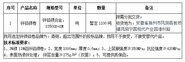 1、招標(biāo)物資信息:宣城海螺建筑光伏公司2024年3月-2024年6月生產(chǎn)用鋅鎂鋁卷(根據(jù)項(xiàng)目結(jié)束時(shí)間)。