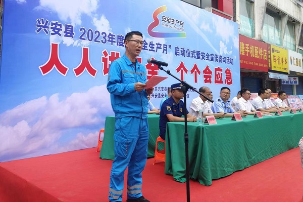 “為認(rèn)真履行企業(yè)主要負(fù)責(zé)人第一責(zé)任人責(zé)任,我承諾:全面落實(shí)安全生產(chǎn)法規(guī)定職責(zé),帶頭研究組織本企業(yè)重大事故隱患排查整治、帶頭落實(shí)全員安全生產(chǎn)崗位責(zé)任,發(fā)揮管理團(tuán)隊(duì)和專(zhuān)家作用……堅(jiān)決防范遏制各類(lèi)生產(chǎn)安全事故發(fā)生。”6月16日,廣西興安縣安全宣傳咨詢(xún)活動(dòng)現(xiàn)場(chǎng),興安海螺公司總經(jīng)理任文皓作為全縣企業(yè)代表,作出鄭重承諾。