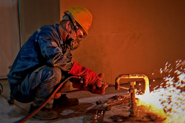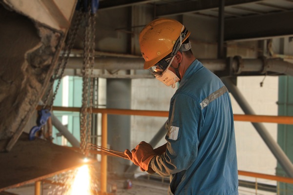 窯檢修現(xiàn)場(chǎng),機(jī)械維修工張紅勝全神貫注地操作著氣割槍?zhuān)幢愕眯膽?yīng)手,他也始終保持謹(jǐn)慎與專(zhuān)注。(王凱/攝)