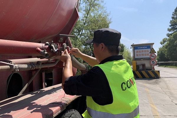 日光正盛,宣城海螺一號(hào)門(mén)外,保衛(wèi)人員陳程正在對(duì)散裝水泥出廠車(chē)輛進(jìn)行鉛封,站好崗、守好責(zé),他們是夏天的“炎值”和“門(mén)面”擔(dān)當(dāng)。(謝能/攝)
