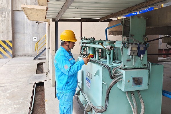 在高溫風(fēng)機(jī)油站前,制造分廠副廠長(zhǎng)羅紅波緊盯著儀器讀數(shù),對(duì)設(shè)備運(yùn)行情況進(jìn)行逐一點(diǎn)檢?!霸O(shè)備‘中暑生病’,也同樣十分危險(xiǎn),點(diǎn)檢工作可馬虎不得。”羅紅波說(shuō)。(朱貴宏/攝)