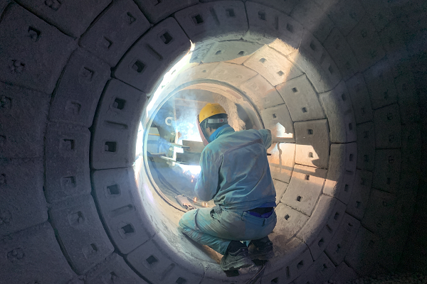 坐標(biāo)烏茲別克斯坦,卡爾希海螺的技改工作正在有序進(jìn)行中,這是水泥磨磨頭密封改造現(xiàn)場(chǎng),烏籍員工加發(fā)在焊接作業(yè)中的背影。(孫艷偉/攝)