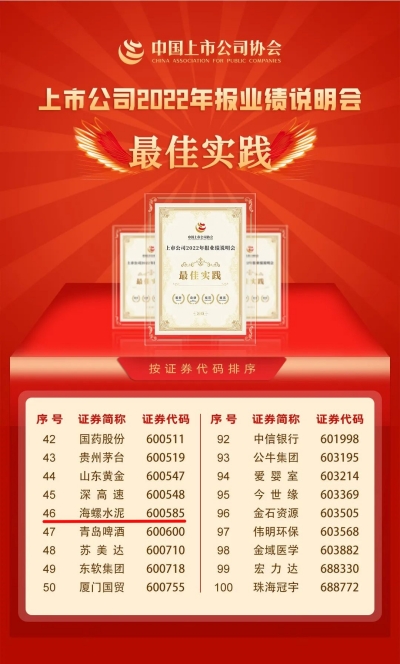 近日,中國上市公司協(xié)會發(fā)布“2022年報業(yè)績說明會最佳及優(yōu)秀實(shí)踐”評選結(jié)果,海螺水泥榮獲“上市公司2022年報業(yè)績說明會最佳實(shí)踐”獎。