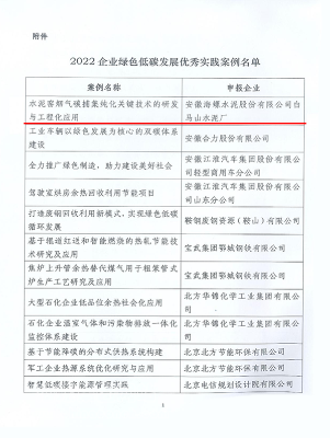 2022年12月,中國企業(yè)聯(lián)合會、中國企業(yè)家協(xié)會發(fā)布《關(guān)于發(fā)布“2022企業(yè)綠色低碳發(fā)展優(yōu)秀實(shí)踐案例”的通知》《關(guān)于入選“2022企業(yè)綠色低碳發(fā)展優(yōu)秀實(shí)踐案例”的告知函》。集團(tuán)公司牽頭組織白馬山水泥廠《水泥窯煙氣碳捕集純化關(guān)鍵技術(shù)的研發(fā)與工程化應(yīng)用》、全椒海螺《水泥生產(chǎn)全流程智能制造關(guān)鍵技術(shù)》均獲選“優(yōu)秀實(shí)踐案例”。