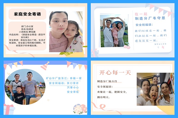 “笑口常開,萬事小心,安全常在。”這是隆安海螺礦山分廠藍(lán)玉江收到的家庭安全寄語,寄語卡片上還有他們一家人的幸福合影。六一來臨之際,為了讓孩子們度過一個(gè)有意義的節(jié)日,同時(shí)也讓員工們時(shí)刻感受到來自家人對(duì)自己平安歸家的期待,隆安海螺開展了以“孩子們的笑容”為主題的親子合影活動(dòng)。