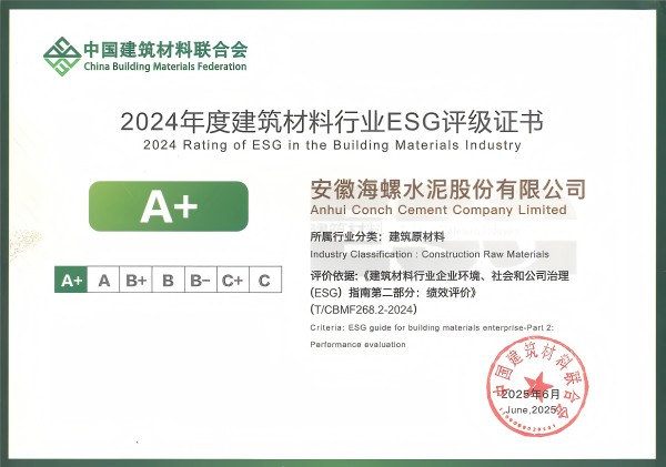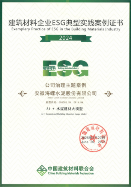 論壇發(fā)布了建筑材料行業(yè)ESG評(píng)級(jí),該評(píng)級(jí)融合國(guó)內(nèi)外主流框架,確定13項(xiàng)行業(yè)議題,明確122項(xiàng)關(guān)鍵績(jī)效指標(biāo),科學(xué)衡量公司發(fā)展韌性。本次評(píng)級(jí)覆蓋131家建筑材料公司,共15家公司榮獲A+評(píng)級(jí)。同時(shí)發(fā)布了2024年度建筑材料行業(yè)ESG典型實(shí)踐案例,涵蓋環(huán)境、社會(huì)、公司治理以及氣候變化4項(xiàng)專題下各5個(gè)實(shí)踐案例。海螺水泥憑借卓越的ESG治理和實(shí)踐,榮獲建筑材料行業(yè)A+評(píng)級(jí),并入選環(huán)境、社會(huì)、治理3項(xiàng)專題實(shí)踐案例。此外,公司應(yīng)邀在論壇上進(jìn)行了以《踐行“雙碳”戰(zhàn)略,引領(lǐng)綠色發(fā)展》為主題的ESG實(shí)踐經(jīng)驗(yàn)分享。