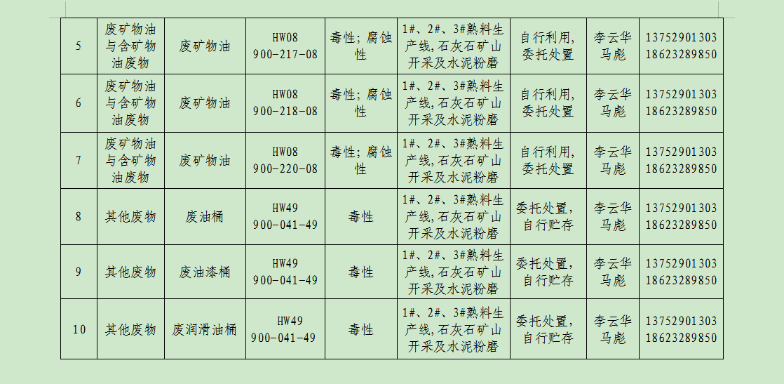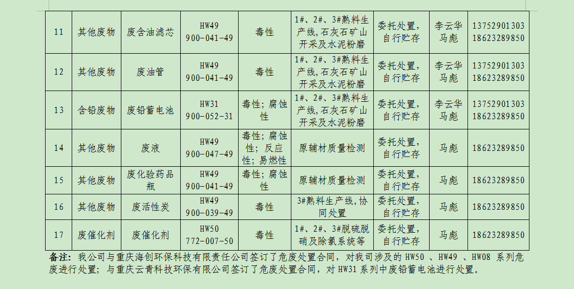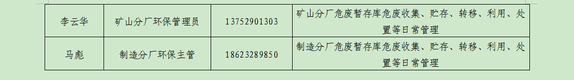 廢棄物的產生單位及管理:礦山分廠由俸云龍負責管理,負責督促員工把產生的危廢分類定期送危廢庫暫存,危廢庫由維修工段工段長負責,負責收集并記錄危廢臺賬;主廠區(qū)由易軍負責管理,負責督促員工把產生的廢分類定期送危廢庫暫存,危廢庫由環(huán)保主管馬彪負責,負責收集并記錄危廢臺賬。危廢庫危廢定期聯(lián)系重慶海創(chuàng)環(huán)??萍加邢挢熑喂尽⒅貞c云青環(huán)??萍加邢薰?/span>等有資質公司回收處理并完善相應危廢聯(lián)單。