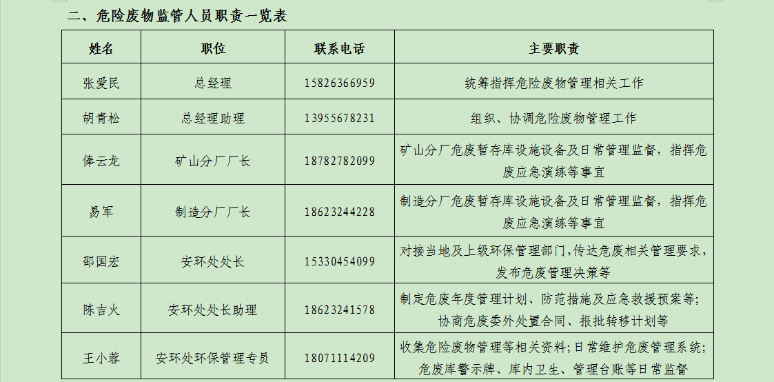 6.三大分廠負責危險廢物的集中、收集、轉貯、防止損失加重。安全環(huán)保處與政府相關安全、環(huán)保、衛(wèi)生等部門協(xié)助協(xié)調。