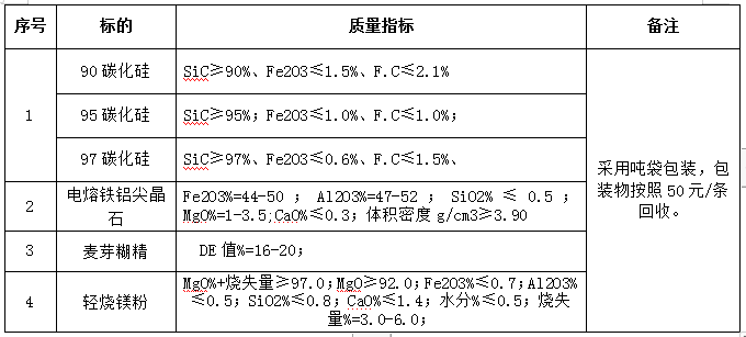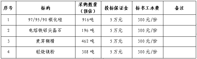 根據(jù)本公司2023年3-4季度耐火磚產(chǎn)品生產(chǎn)計劃,結(jié)合前期招標報名情況,為確保生產(chǎn)所需原料及時采購進廠。現(xiàn)對碳化硅、電熔鐵鋁尖晶石、麥芽糊精、輕燒鎂粉等原材料,本著“公開、公平、公正、透明”的原則再次公開招標,誠邀經(jīng)營資質(zhì)能力較好、保供和服務(wù)能力較強的生產(chǎn)型企業(yè)參加投標?,F(xiàn)就招標相關(guān)事項請示如下: