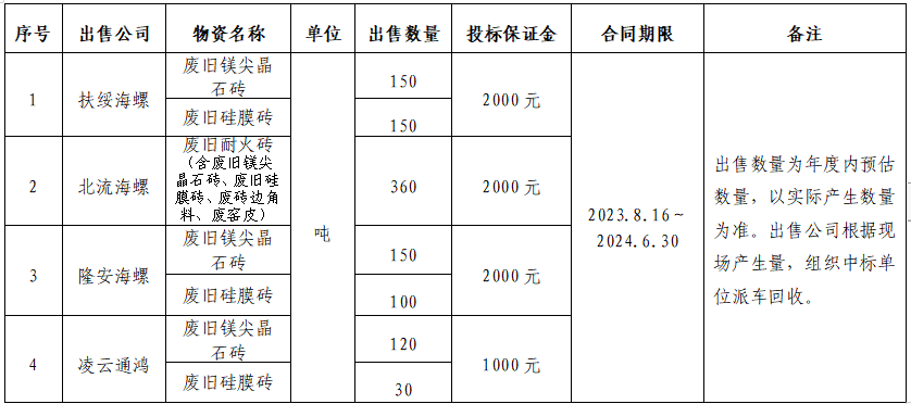為規(guī)范區(qū)域內(nèi)各公司廢舊耐火磚出售管理,保證廢舊耐火磚出售過程的公開、公平、公正,擬開展廣西區(qū)域2023-2024年度廢舊耐火磚出售招標工作,現(xiàn)將招標信息公示如下: