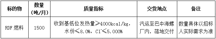 根據(jù)巴中海螺生產(chǎn)經(jīng)營(yíng)需求,現(xiàn)對(duì)RDF燃料采購(gòu)業(yè)務(wù)進(jìn)行公開招標(biāo),本著公平、公正、公開、透明的原則,現(xiàn)將招標(biāo)相關(guān)事宜公示如下: