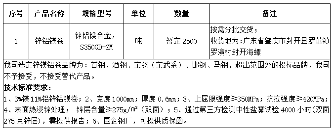 1、招標(biāo)物資信息:宣城海螺建筑光伏公司2023年12月-2024年2月生產(chǎn)用鋅鎂鋁卷(根據(jù)項目結(jié)束時間)。
