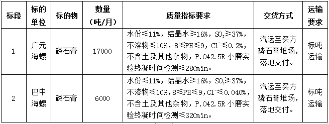 3.新渠道需經(jīng)招標(biāo)人實地調(diào)研取樣化驗合格后方可參與投標(biāo),除化學(xué)指標(biāo)外,招標(biāo)人需對新渠道磷石膏凝結(jié)時間進行檢測,其中廣元海螺要求在PO42.5R小磨實驗中終凝時間不高于320min,巴中海螺要求在PO42.5R小磨實驗中終凝時間不高于360min。