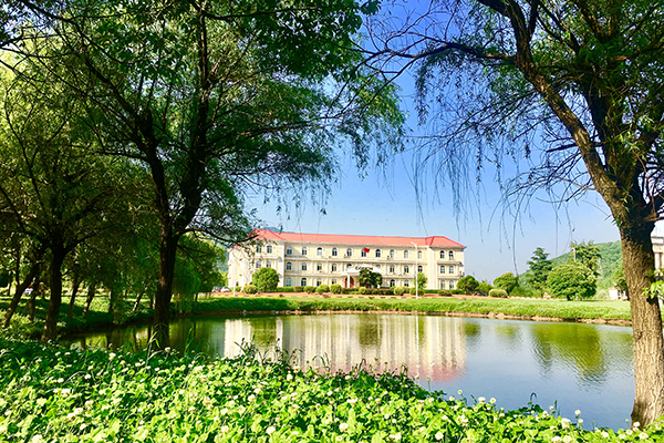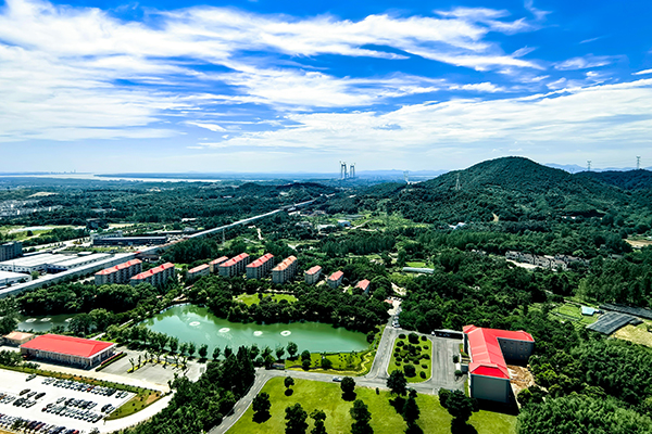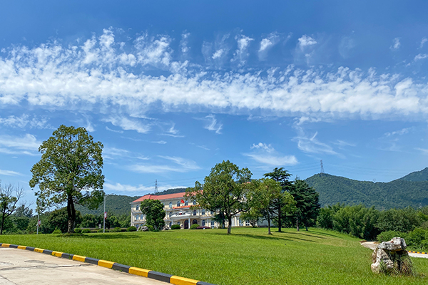 藍(lán)天白云下,蔥郁樹木錯落點綴著如茵綠草,遠(yuǎn)處的辦公樓靜立其間,連綿青山為幕,勾勒出一幅明媚清新的自然景致。