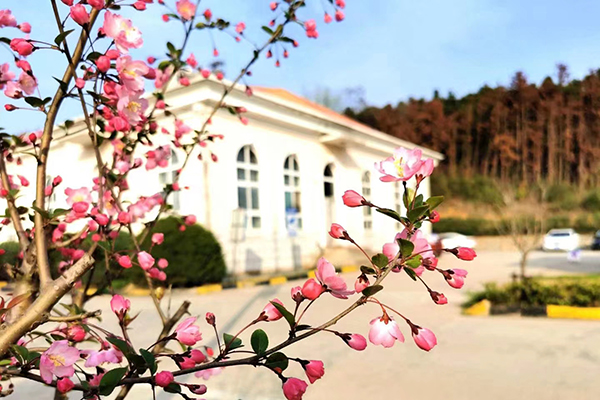 “無人會得東風(fēng)意,春色都將付海棠”。在食堂門前,一株株海棠嬌艷似少女的笑靨,微風(fēng)輕拂,花朵如粉蝶般飄舞。