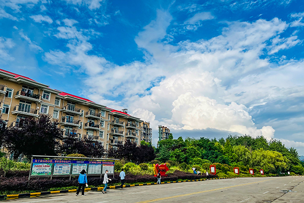 藍(lán)天白云悠然鋪展,公司萬噸線宿舍樓與蔥郁綠植相映成趣,行人于開闊道路間漫步,在晴朗日光里勾勒出一幅閑適生動的生活畫卷。
