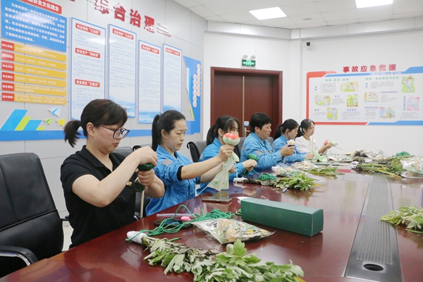 大家先將新鮮的艾草與菖蒲精心搭配,再用寓意吉祥的五彩繩細(xì)細(xì)捆扎。有的職工別出心裁地在門掛上系上親手縫制的香囊,有的則用工整的字跡在紅紙上寫下“平安順?biāo)臁钡淖8UZ(yǔ)掛在艾草枝頭,大家精心捆扎的端午門掛各具特色。有的職工將做好的艾草錘送給長(zhǎng)期伏案的同事希望能幫助他緩解疲勞。還有人打算把門掛掛在班組的大門上,希望2025年工作順順利利。