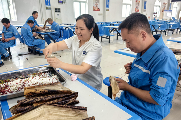 竹筍清香的粽葉、各式各樣的餡料整齊擺放,后勤組已為包粽子大賽提前做好了準(zhǔn)備?;顒右潦?,主持人講解了本次“速度與質(zhì)量”挑戰(zhàn)賽規(guī)則,隨后參賽員工迅速投入“戰(zhàn)斗”,一雙雙巧手上下翻飛,將粽葉卷成漏斗狀,填入餡料,壓實(shí)、封口、捆綁,動作嫻熟流暢。不一會兒,形態(tài)各異的粽子就在大家手中誕生,有的棱角分明,緊實(shí)飽滿;有的小巧玲瓏,別具一格;有的圓潤飽滿,憨態(tài)可掬。雖然大家包粽子的技術(shù)參差不齊,但臉上都洋溢著開心的笑容,享受著收獲的樂趣。