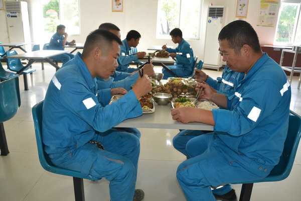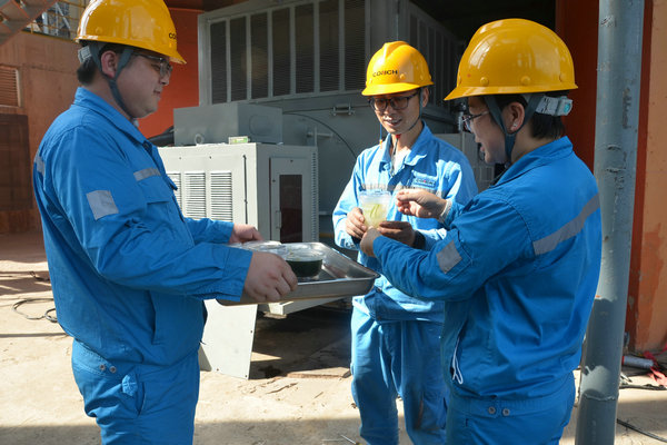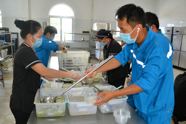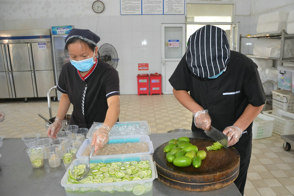采摘下來的新鮮龍眼和檸檬很快被送往食堂,食堂師傅們忙碌起來,將飽滿多汁的龍眼剝殼取肉,檸檬切片榨汁,熬制當(dāng)?shù)靥禺a(chǎn)涼粉草。龍眼果肉與檸檬片在清冽礦泉水中舒展,釋放出清甜與微酸的完美協(xié)奏;涼粉草熬制的“北流涼粉”,凝凍如墨玉,清涼解暑。天然原料經(jīng)巧手化作兩大消暑佳品——晶瑩剔透的龍眼檸檬水與地道爽滑的“北流涼粉”。冰鎮(zhèn)后的飲品帶著果香與涼意,被后勤人員分裝成杯,及時(shí)送到各崗位。