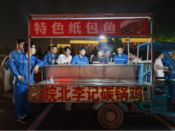 現(xiàn)場互動中,協(xié)作的暖意更濃。外燴團(tuán)隊(duì)忙得熱火朝天時,員工們自發(fā)組成“志愿小分隊(duì)”,有的幫忙傳遞食材,有的協(xié)助維持取餐秩序,還不忘和外燴師傅交流烤串技巧。“你們烤串講究火候,我們生產(chǎn)水泥講究配比,都是‘技術(shù)活’!”一位老員工的玩笑話,讓外燴師傅與在場員工都笑了起來。新老員工圍在取餐區(qū),主動為彼此遞餐、分享美食,你幫我拿烤翅,我替你取飲料,簡單的互動里,滿是團(tuán)隊(duì)成員間的默契與溫情。